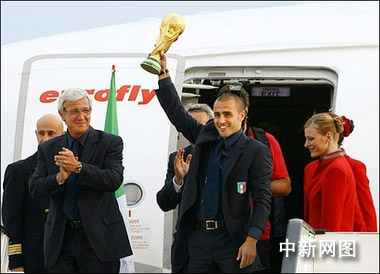 中新網7月12日電 據新京報報道,第四次登頂世界杯的意大利隊昨天凌晨乘坐專機回到了祖國,當飛機在羅馬郊區的海軍機場著陸后,一場席卷意大利全國的慶;顒永_了序幕。意大利隊全體成員被授予共和國勛章。