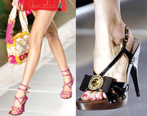 今夏鞋跟絕對是重點,各色拼接的材質和造型的鞋跟,令人眼花繚亂。大量采用自然材質,并強調以“拼接”手法表現色彩感或復雜工藝,使得新一季的鞋子變得更為搶眼,成為時尚秀的“主角”。