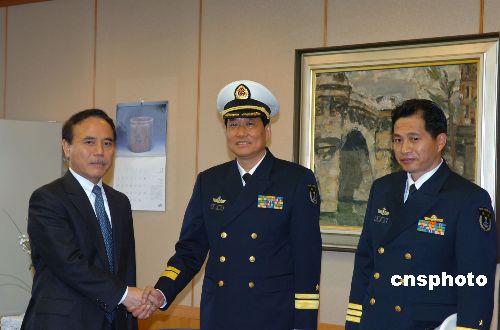 11月29日上午,正在日本進(jìn)行正式友好訪問的中國海軍軍艦訪日?qǐng)F(tuán)指揮員肖新年少將一行來到日本防務(wù)省,與日本軍界進(jìn)行交流活動(dòng)。圖為肖新年少將(中)與日本防務(wù)省遷優(yōu)參事官(左)握手,訪日中國海軍導(dǎo)彈驅(qū)逐艦“深圳號(hào)”艦長朱建達(dá)上校(右)陪同會(huì)見。中新社發(fā) 滕劍峰 攝