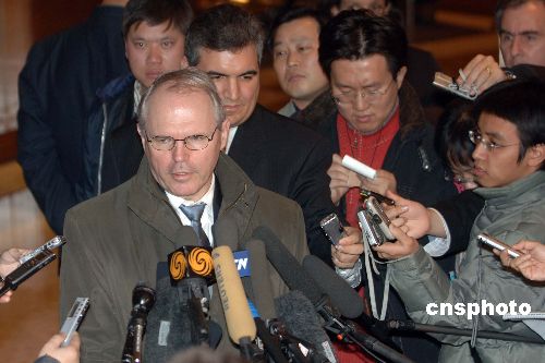 十二月五日,美國助理國務卿希爾結束對朝鮮的訪問抵達北京,在其下榻的酒店接受記者采訪。中新社發(fā) 廖攀 攝