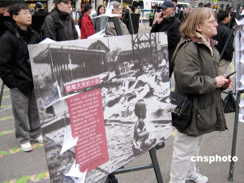 十二月九日下午,由紐約地區(qū)留學(xué)生、專家學(xué)者以及當(dāng)?shù)厝A人團(tuán)體聯(lián)合舉辦的南京大屠殺七十周年紐約紀(jì)念集會(huì),在曼哈頓著名的聯(lián)合廣場(chǎng)舉行。紀(jì)念活動(dòng)展示大量史料圖片展板,悼念大屠殺中遇難與受難的同胞,當(dāng)?shù)厝A人和紐約民眾重溫這段歷史真相。活動(dòng)中,現(xiàn)場(chǎng)演講與觀眾簽名抗議日本當(dāng)局少數(shù)右翼分子否認(rèn)和淡化這段慘絕人寰的侵略歷史。中新社發(fā) 鄧悅 攝