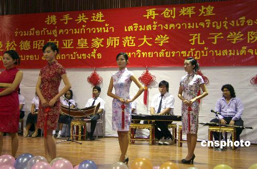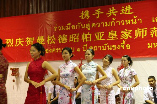 泰國曼松德昭帕亞皇家師范大學孔子學院十九日在該校隆重舉行孔子學院成立周年慶典活動,慶典儀式后泰中兩國學生以“多元文化的融合,和諧世界的構建”為主題共同表演了一場精彩的文藝演出,圖為泰中兩國學生的旗袍服裝表演。中新社發 顧時宏 攝