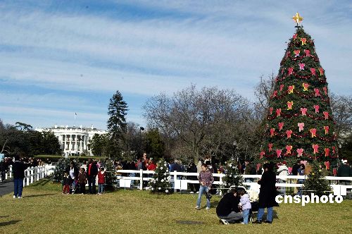 當(dāng)?shù)貢r(shí)間12月24日,在圣誕節(jié)平安夜前,白宮門(mén)前巨大的圣誕樹(shù)吸引了眾多前來(lái)參觀的游人。一九二三年平安夜起,白宮前第一夫人格蕾絲就倡導(dǎo)在白宮門(mén)前每年插上圣誕樹(shù),并命名為“國(guó)家圣誕樹(shù)”,到一九七三年,當(dāng)時(shí)的白宮主人為了保護(hù)森林,下令停止每年砍伐樹(shù)木做圣誕樹(shù),叫人種植了一棵巨大的圣誕樹(shù),美國(guó)五十個(gè)州還送來(lái)小圣誕樹(shù)樹(shù)種在周?chē)员阌稳擞^賞。中新社發(fā) 邱江波 攝