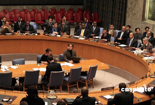 聯合國安理會二十七日就威脅國際和平與安全的恐怖主義問題舉行緊急磋商,并通過主席聲明,用“最強烈的字眼”譴責當日早些時候發生在巴基斯坦的致使貝·布托遇害身亡的恐怖襲擊事件。中新社發 李靜 攝