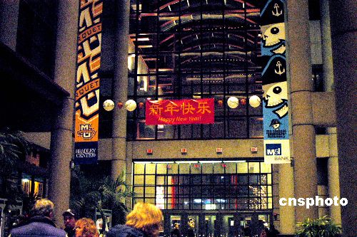 當?shù)貢r間二月二日,姚明率領(lǐng)的休斯敦火箭隊作客密爾沃基布拉德利球館,客場以九十一比八十三險勝另一名中國球員易建聯(lián)所在的雄鹿隊,獲得三連勝。為了迎接這場“姚易大戰(zhàn)”,布拉德利中心看上去更像是一個“廟會”,到處可見“新年快樂”的漢語條幅。中新社發(fā) 李靜 攝