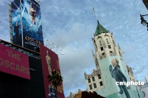美國第八十屆電影奧斯卡頒獎典禮即將于二月二十四日傍晚舉行,洛杉磯好萊塢星光大道上高豎巨型廣告,希望招攬觀眾人氣。中新社發(fā) 賈國榮 攝