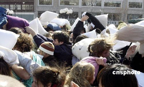 3月22日,紐約數(shù)百名青年聚居在曼哈頓聯(lián)合廣場(chǎng)展開一年一度的枕頭大戰(zhàn)。大家用睡了一個(gè)冬天的枕頭將彼此“砸醒”,笑迎春天的到來(lái)。中新社發(fā) 鄧悅 攝