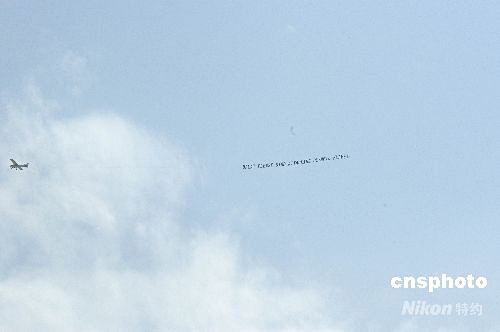 當(dāng)?shù)貢r(shí)間四月二十日,美國(guó)密歇根州華人華僑在密歇根大學(xué)所在城市安娜堡舉行聲勢(shì)浩大的援奧運(yùn)反暴力和平集會(huì)。當(dāng)?shù)厝A商租用了小型飛機(jī),在集會(huì)活動(dòng)的上空拖出一條巨幅抗議標(biāo)語(yǔ):“達(dá)賴,請(qǐng)你停止攻擊奧運(yùn)圣火。”中新社發(fā) 鄧悅 攝
