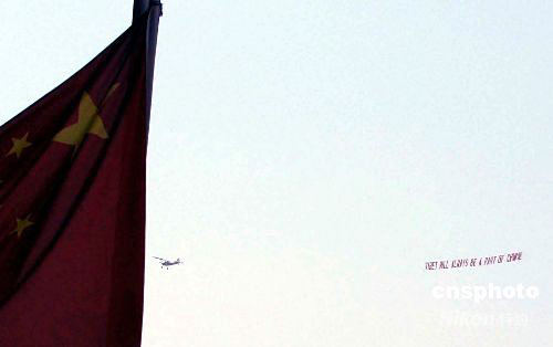 4月22日,紐約華人華僑租用一架小型飛機飛越曼哈頓,打出“西藏永遠是中國的一部分”的橫幅。中新社發 龔文謨 攝