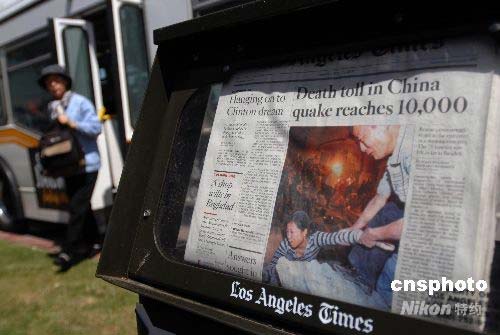 當地時間五月十三日,美國洛杉磯地區的主流媒體和主要中文媒體均在頭版頭條和內頁突出報道四川汶川大地震。圖為當天出版的美國主流媒體《洛杉磯時報》在頭版突出報道汶川大地震。中新社發 張煒 攝