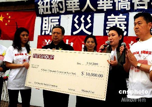 當?shù)貢r間5月18日,紐約華人華僑舉辦賑災(zāi)義演,200多名華裔演藝人員冒雨獻藝,現(xiàn)場捐款。中國駐紐約總領(lǐng)事彭克玉(左二),當天到賑災(zāi)義演現(xiàn)場等多個募捐點,向義工和捐款者表示慰問與感謝。中新社發(fā) 龔文謨 攝