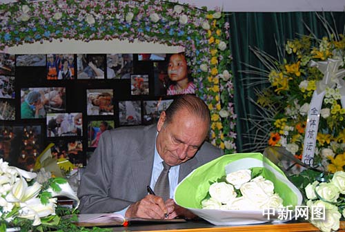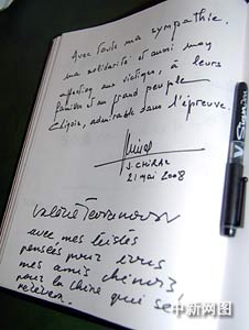 巴黎時間二十一日上午,法國前總統(tǒng)希拉克專程來到中國駐法國大使館,向中國汶川地震的遇難者表示深切哀悼。希拉克在吊唁簿上寫道:“對中國遇難者及他們的家屬表示深切的哀悼和慰問,對偉大的中國人民在此次抗震救災(zāi)中的表現(xiàn)表示欽佩。” 作者:吳衛(wèi)中
