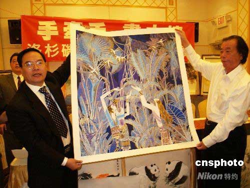 5月27日,著名旅美云南重彩畫家丁紹光捐出自己6幅畫作,參加洛杉磯66位畫家及書法家“手牽手、畫中情”共同為四川大地震捐畫賑災義賣活動。當天,丁紹光的5幅云南重彩畫即被高價拍賣,這次義賣所有款項將交中領館轉四川災區。圖為丁紹光(右)展示義賣畫作,左為南加州華人團體聯合總會會長程遠。中新社發 盧威 攝