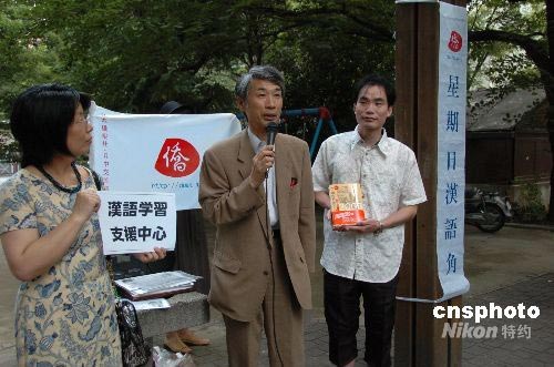 7月13日,在東京舉行的星期日漢語角第48次交流會上,日本僑報社宣布漢語學習支援中心正式成立。漢語學習支援中心的首個支援項目是,面向研究者的中文讀解力養(yǎng)成講座9月開講,由日本麗澤大學中文系三瀦正道教授擔綱,每周一下午5點至7點免費為各大學的研究生和年輕學者、漢語學習者提供權(quán)威服務(wù)。圖為三瀦正道教授(中)向漢語角參加者介紹漢語學習支援中心。中新社發(fā) 段躍中 攝