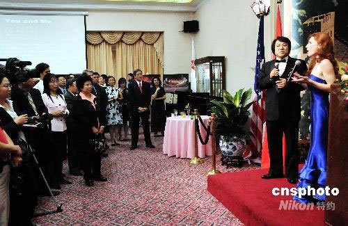 當(dāng)?shù)貢r(shí)間九月九日,在中國(guó)駐美大使館舉行的奧運(yùn)成功答謝招待會(huì)上,北京奧運(yùn)開(kāi)幕主題歌《我和你》再度激蕩中美各界朋友的內(nèi)心。圖為來(lái)自華盛頓著名專(zhuān)業(yè)合唱團(tuán)職業(yè)歌唱家用意大利美聲唱法為招待會(huì)四百余名嘉賓演唱了這首歌曲,贏得了熱烈掌聲和贊揚(yáng)。中新社發(fā) 邱江波 攝