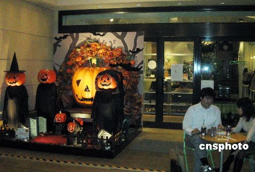 10月21日晚,一對戀人在南瓜幽靈前悠閑地喝茶聊天。10月是收獲的季節,而南瓜代表這一種碩果累累的喜悅。從10月中旬開始,東京的CBD丸之內商業大道,舉行了一場別開生面的南瓜藝術展。被雕塑成各種形狀的南瓜展示在大街的兩側。而這一組“南瓜幽靈”最受人歡迎。中新社發 徐靜波 攝