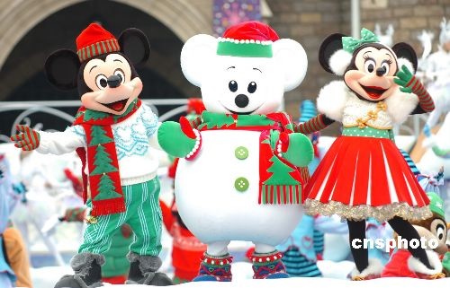 11月7日,東京迪斯尼為迎接2008年圣誕推出了新的卡通形象“雪米奇”。數萬游客從四面八方趕至爭相一睹這個漂亮善良的新朋友。圖為在歌舞表演中的米奇、米妮與雪米奇。中新社發 朱沿華 攝