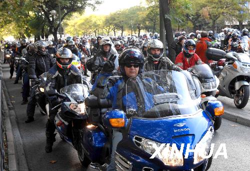 11月8日,眾多摩托車手在西班牙首都馬德里市中心街道參加大游行。當日,來自西班牙各地的上萬名摩托車手在首都馬德里參加大游行,呼吁政府部門改善道路交通條件,保障摩托車出行安全。據統計,西班牙2007年共有500余名摩托車手在交通事故中喪生。新華社記者陳海通攝