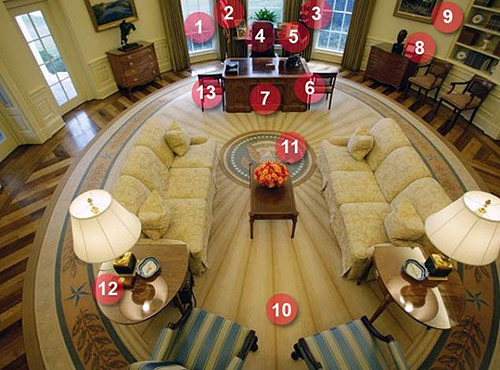 以下為奧巴馬入主宮橢圓形辦公室后,其內部陳設猜想(號碼如圖):