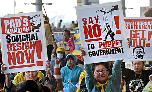 11月28日,泰國反政府的人民民主聯(lián)盟(民盟)支持者在曼谷素萬那普國際機(jī)場(chǎng)內(nèi)繼續(xù)抗議。泰國總理頌猜27日晚在泰國北部城市清邁發(fā)表全國電視講話,宣布在曼谷素萬那普國際機(jī)場(chǎng)和廊曼機(jī)場(chǎng)實(shí)施緊急狀態(tài)法。但是民盟支持者依舊占領(lǐng)著這兩個(gè)機(jī)場(chǎng)。