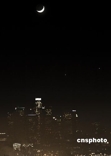當地時間十二月一日晚七時許,洛杉磯市中心上空西南方出現“雙星拱月”的少見天象,耀眼的金星(左)和明亮的木星(右)伴隨著一彎新月在夜空中格外醒目。據天文學家介紹,這三個天體盡管每年有一次相遇的機會,但肉眼可見的時候卻很少。中新社發 張煒 攝