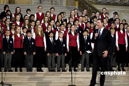美國(guó)候任總統(tǒng)奧巴馬的就職典禮,將于當(dāng)?shù)貢r(shí)間一月二十日在首都華盛頓舉行。曾多次獲得格萊美獎(jiǎng)的舊金山男童、女童合唱團(tuán)應(yīng)邀出席并擔(dān)任表演嘉賓。一月十五日下午,兩個(gè)合唱團(tuán)的八十六名團(tuán)員在舊金山市府大廳作啟程前的熱身演出,市長(zhǎng)紐森為他們送行并稱贊小歌手們是舊金山的驕傲。紐森宣布當(dāng)日是“舊金山男童合唱團(tuán)和女童合唱團(tuán)日”。中新社發(fā) 陳鋼 攝