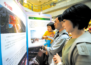 相比往年,本次“上海與上海世博會”圖片展首次利用了羽田機場這一重要交通窗口作為展示平臺。羽田機場1號出發大樓2樓大廳內,100多幅精心挑選的照片巨大而醒目,多媒體的宣傳片循環播放,讓機場成了一個“上海世博推介臺”。展區門口,“海寶”揮手迎客,可愛的模樣煞是惹人喜歡,孩子們紛紛上前拉拉“海寶”的手、親親“海寶”的臉。圖片展示成了機場內的一個焦點,眾多來往旅客紛紛駐足觀看,舉辦方則在不停地派發世博宣傳資料、贈送世博小禮品,氣氛十分活躍。
