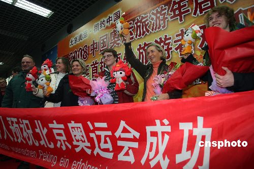 1月1日,首批境外游客抵達北京首都機場,與此同時,2008中國奧運旅游年活動宣布啟動。中新社發 杜洋 攝