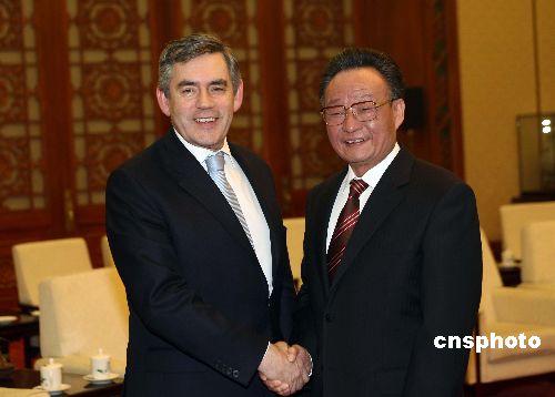1月18日,中國全國人大常委會委員長吳邦國在北京人民大會堂會見來訪的英國首相布朗。中新社發 盛佳鵬 攝