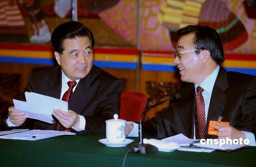 圖:胡錦濤與西藏代表共同審議政府工作報告