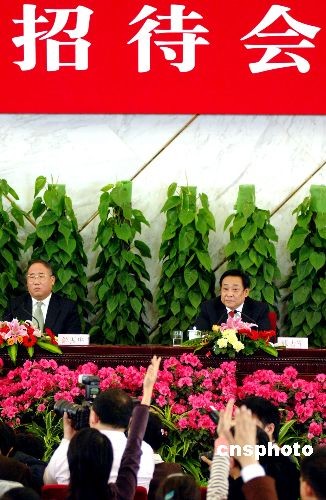 3月11日,十一屆全國人大一次會議新聞發布會在北京人民大會堂舉行。國家發展和改革委員會副主任解振華(左)、國家環境保護總局副局長張力軍,就環境資源、節能減排、2008奧運期間北京空氣質量等問題回答記者提問。中新社發 王東明 攝