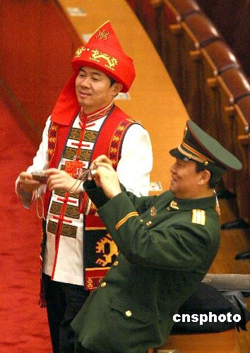 3月11日,出席十一屆全國人大一次會議第四次全體會議的軍人代表、少數民族代表,會后在人民大會堂拍照留念。中新社發 張宇 攝
