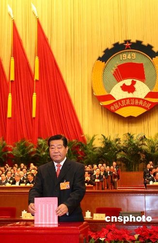 3月13日下午3時,全國政協十一屆一次會議第四次全體會議在北京人民大會堂舉行,會議的主要議程是選舉政協第十一屆全國委員會主席、副主席、秘書長和常務委員。圖為賈慶林進行投票。中新社發 盛佳鵬 攝