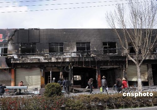 3月20日,工作人員在清理拉薩市林廓北路上被焚毀的商鋪。據了解,拉薩市有840多家商戶在打砸搶燒事件中受損,直接經濟損失超過2億元。中新社發 廖攀 攝