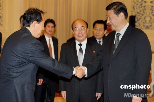 4月29日上午,中國國家副主席習近平在北京人民大會堂親切會見訪華的朝鮮外相樸義春(中)及其隨行人員。中新社發 任晨鳴 攝