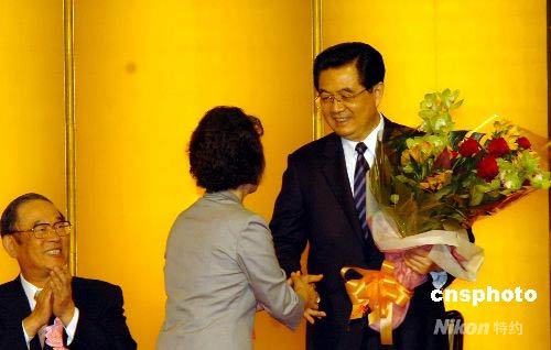5月8日午間,正在日本進行國事訪問的中國國家主席胡錦濤出席了日中協會等日本七團體和四僑團聯合舉行的歡迎宴會,1300名日本各界人士出席了這一活動。圖為胡錦濤在歡迎宴會上接受獻花。中新社發 朱沿華 攝