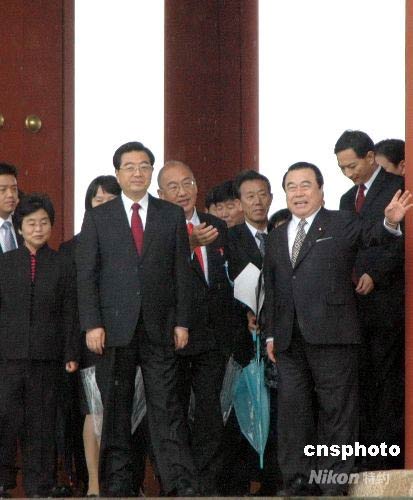 5月10日上午11時40分,正在日本進行國事訪問的中國國家主席胡錦濤及夫人劉永清在日本國土交通大臣冬柴鐵三的陪同下,參觀奈良平城京遺跡朱雀門。中新社發 關妍 攝