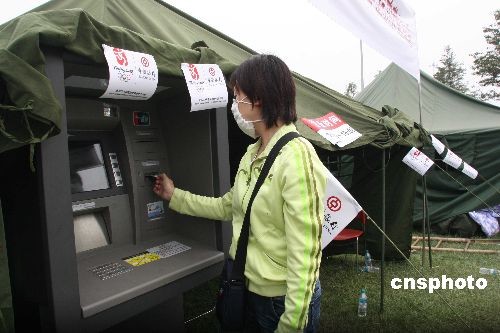 圖為設(shè)在四川都江堰災(zāi)區(qū)的帳篷ATM機(jī)。