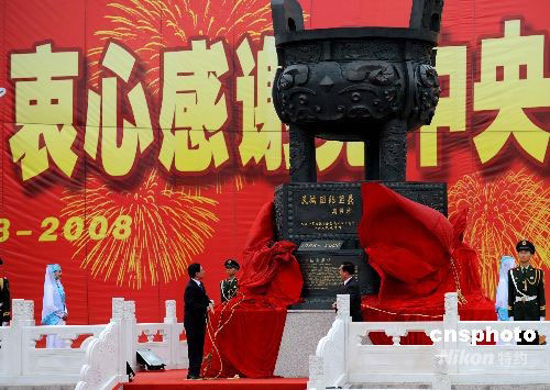 9月22日,中共中央政治局常委、中央紀委書記賀國強(左),與寧夏回族自治區黨委書記陳建國,一同為中央贈送寧夏的民族團結寶鼎揭幕。當日上午,以賀國強為團長的中央代表團乘專機抵達銀川,參加寧夏回族自治區成立50周年慶祝活動。中新社發 廖攀 攝