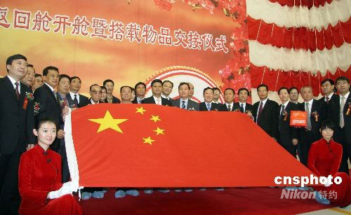 10月1日上午,神舟七號載人飛船返回艙在其誕生地——中國航天科技集團公司所屬中國空間技術研究院舉行開艙暨搭載物交接儀式,伴隨三位中國航天員太空飛行六十八小時二十七分鐘的一批特殊“乘客”一一精彩亮相,隨后各歸其主。圖為出席儀式各方面負責人合影留念。中新社發 孫自法 攝