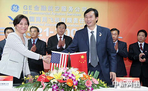 中國商用飛機有限責任公司與美國通用金融航空服務公司(GECAS)四日在珠海航展上簽署一份涉及金額近八億美元的二十五架新支線飛機ARJ21-700的購機協議。孫自法 攝