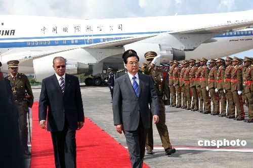 當地時間二月十六日下午四時許,中國國家主席胡錦濤飛抵路易港,開始對毛里求斯進行國事訪問,這也是他此次亞非五國友好合作之旅的最后一站。毛里求斯總理拉姆古蘭在機場舉行隆重儀式,熱烈歡迎胡錦濤到訪。中新社發 齊彬 攝