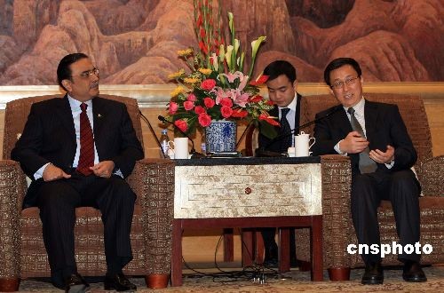 2月23日晚,上海市市長韓正在上海虹橋迎賓館會見巴基斯坦總統(tǒng)扎爾達(dá)里,韓正熱情邀請巴基斯坦總統(tǒng)參觀2010年上海世博會。中新社發(fā) 潘索菲 攝