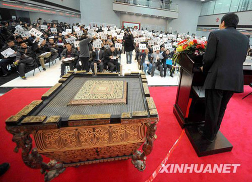 3月8日,“2008北京第29屆奧運會開幕式演出道具‘缶’專場拍賣會”在北京產權交易所落槌。首個標的共十個缶以1.3萬元總價起拍,經過近百輪激烈競價,最終以70.6萬元被347號買家競得。據介紹,當日有1000只缶約53個標的投入競拍,共有439家單位和個人報名參與了現場競買,52名競買人以5244.7萬元的總價拍走1000個奧運缶,單個均價約5.2萬元,較0.11萬元的單個起拍均價而言,身價大增46倍。此次拍賣會創造了奧運物資拍賣歷史上拍賣持續時間最長、競買人最多、競價輪次最多、溢價率最高4個紀錄。