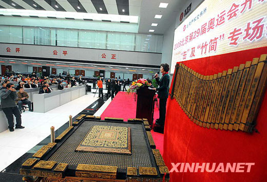 3月18日,2008年北京奧運會開幕式演出道具“缶”及“竹簡”專場拍賣會在北京產權交易所進行,這也是“缶”和“竹簡”的最后一場專場拍賣。羅曉光 攝
