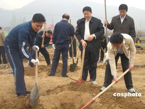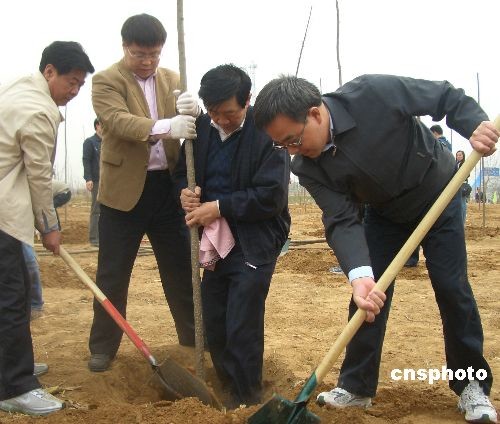 2009年3月21日,河北省及石家莊市黨政軍領導及省市四大辦公機關干部、部隊官兵1900人,在石家莊市鹿泉市山前大道韓莊生態林業基地,建設“省級領導紀念林”、“市級領導紀念林”、“駐石部隊紀念林”100多畝,栽植速生楊樹12000株,再一次掀起了省會造林綠化高潮。中新社發 俱凝搏 攝