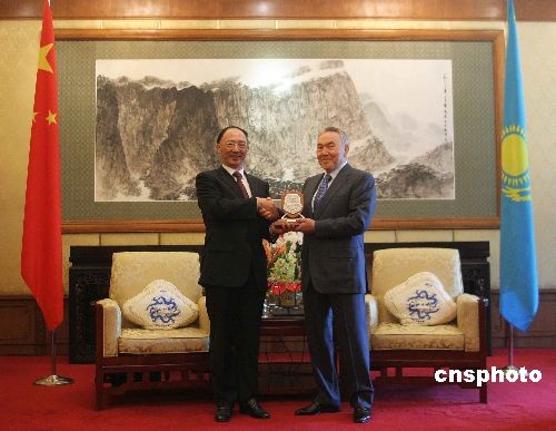 4月16日,中國國家體育總局局長、中國奧委會主席劉鵬在北京釣魚臺國賓館會見哈薩克斯坦總統納扎爾巴耶夫,并向納扎爾巴耶夫總統頒發中國奧委會勛章,以表示其對中國體育事業的支持。納扎爾巴耶夫此行是應中國國家主席胡錦濤邀請,于15日傍晚抵達北京,開始對中國進行為期5天的國事訪問。訪華期間,納扎爾巴耶夫將與中國國家主席胡錦濤、全國人大常委會委員長吳邦國和國務院總理溫家寶進行會見,他還將出席博鰲亞洲論壇2009年年會,這是納扎爾巴耶夫2005年連任總統以來第2次對中國進行國事訪問。中新社發 富田 攝