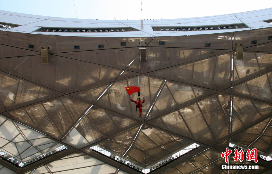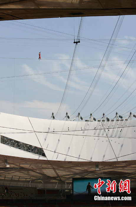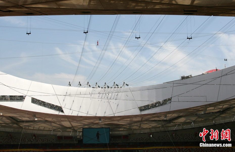7月2日,在鳥巢上空艱難生活60天之后,高空王子阿迪力告別鳥巢回到地面,同時創造了60天累計連續走綱絲時間最長吉尼斯世界紀錄。圖為阿迪力用吊威亞的方式回到地面。中新社發 富田 攝