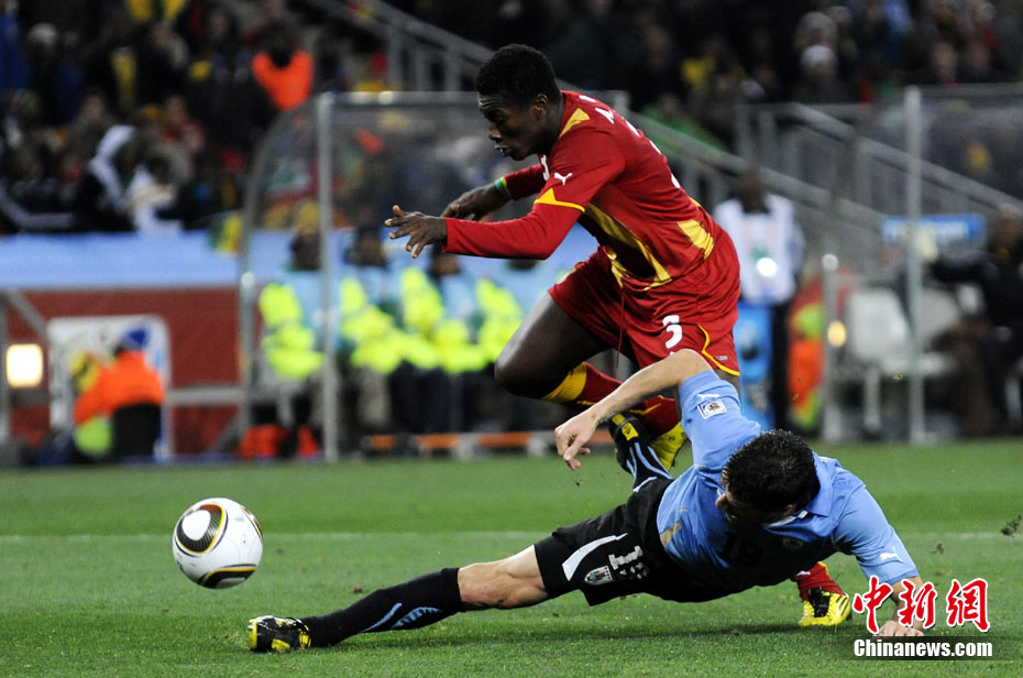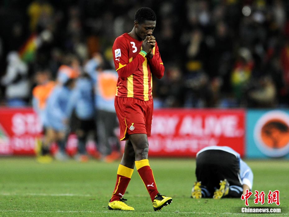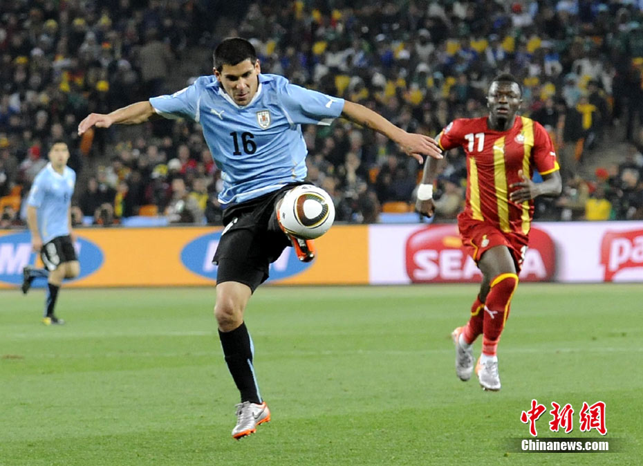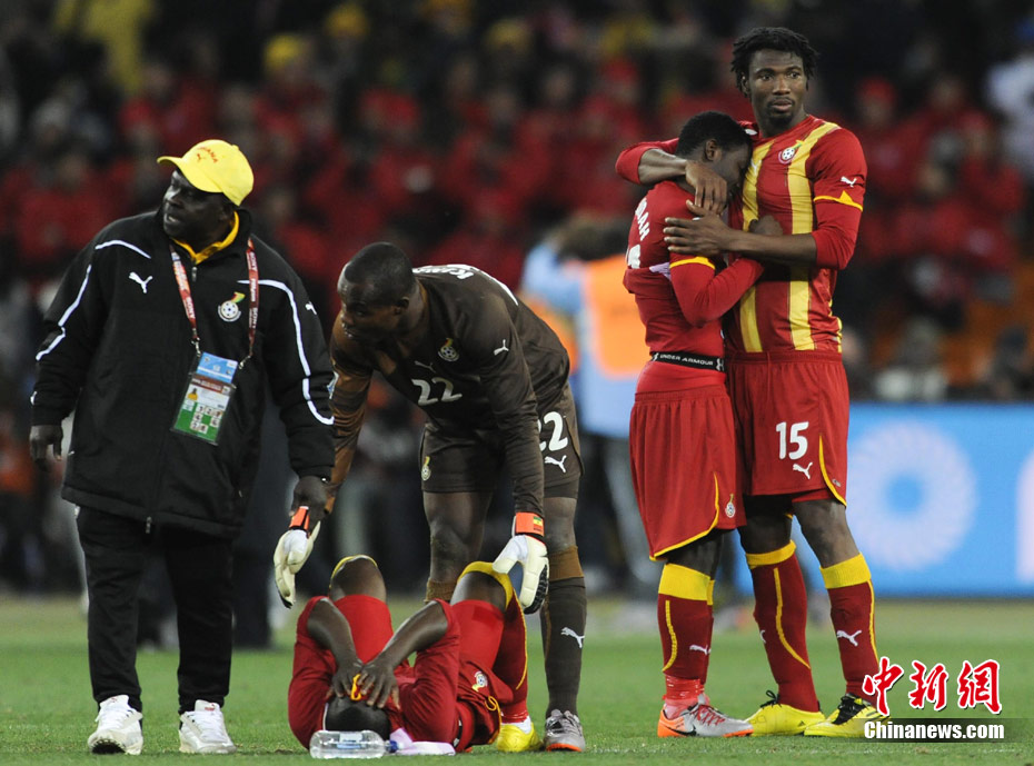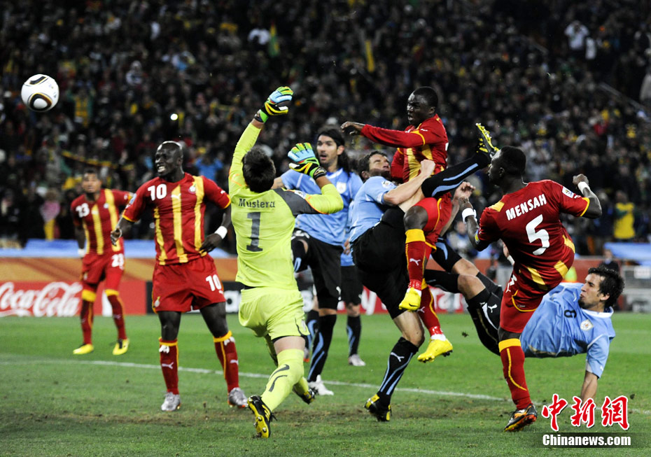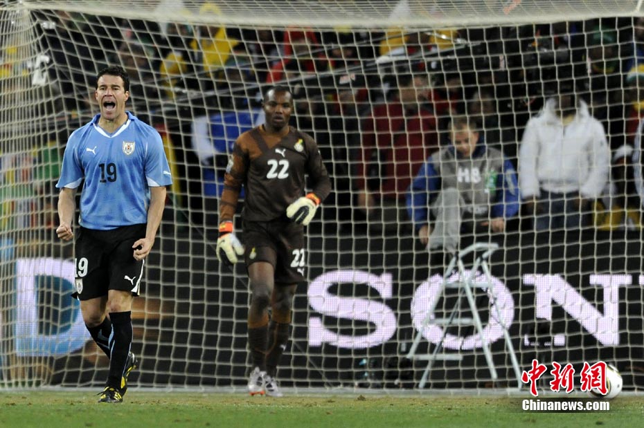 北京時(shí)間7月3日凌晨2:30,南非世界杯進(jìn)行了1/4決賽的第二場爭奪,由烏拉圭在約翰內(nèi)斯堡的足球城球場迎戰(zhàn)加納隊(duì)。120分鐘時(shí)間內(nèi),雙方憑借弗蘭和蒙塔里的進(jìn)球,1-1戰(zhàn)成平局。在點(diǎn)球大戰(zhàn)中,烏拉圭4-2擊敗對手,晉級半決賽。 中新社記者 廖攀 攝