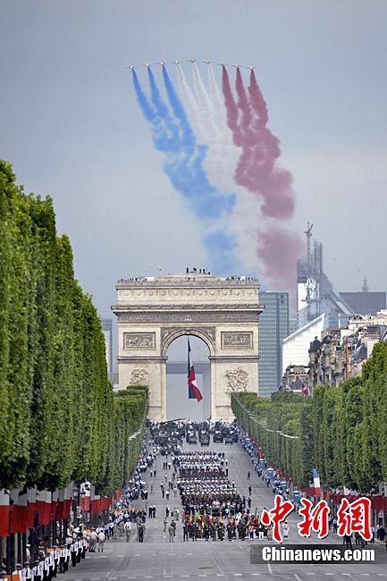 當地時間7月14日,法國巴黎舉行了盛大的國慶日閱兵式。圖為法國總統薩科齊在法國三軍總參謀長愛德華·紀堯的陪同下檢閱部隊。 中新社發 吳衛中 攝